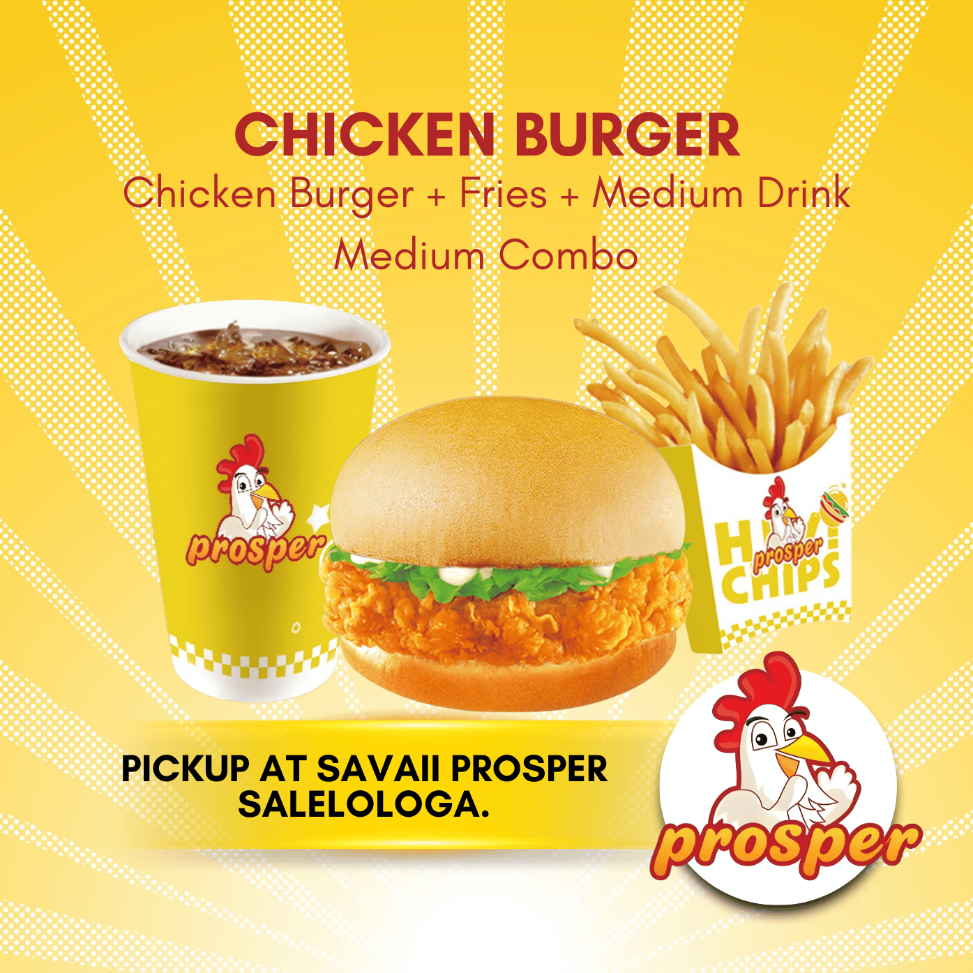 CHICKEN BURGER MEDIUM COMBO (Pickup from Prosper Savaii in Salelologa).Meal Includes:- Chicken Burger- Fries- Medium DrinkEnjoy a tasty selection of... Read more
