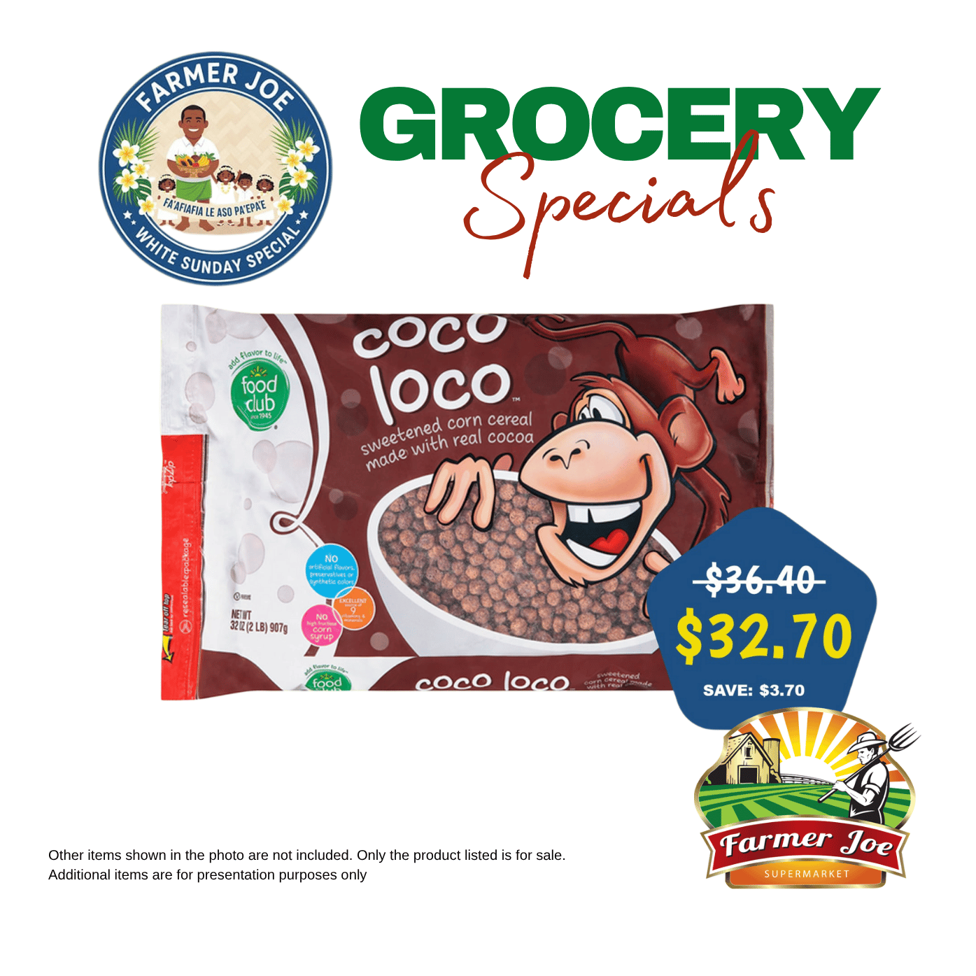 GROCERY SPECIAL! Food Club Coco Loco Cereal 32oz "PICKUP FROM FARMER JOE SUPERMARKET VAITELE ONLY"