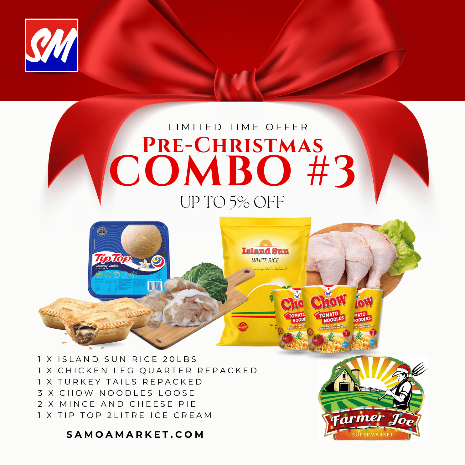 Grab this exclusive Pre-Christmas Combo #3 before it's gone—a limited-time offer packed with everything you need for the festive season. Curated specially for the holidays, this bundle delivers exceptional value and convenience. Perfect for families planning ahead, it combines quality essentials at an unbeatable price. Available for pickup only at Farmer Joe Supermarket, Vaitele—secure yours today while stocks last. Don't miss out on this seasonal special designed to make your Christmas preparations easier and more affordable.