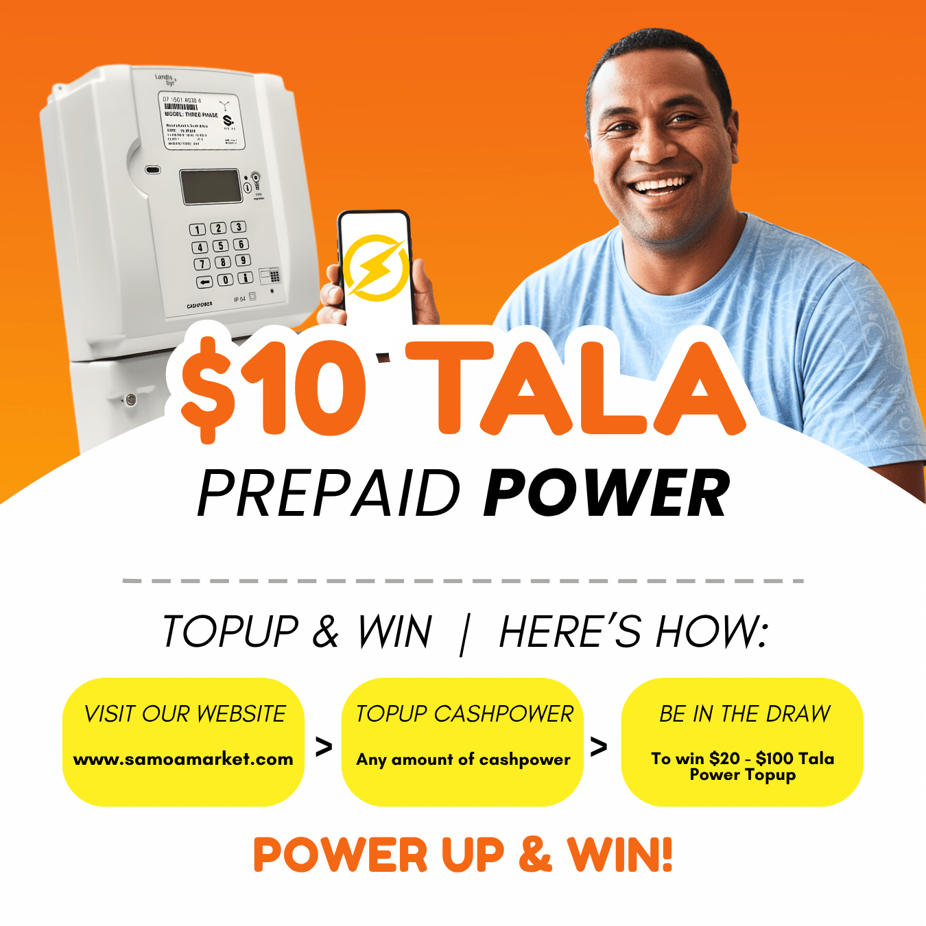 Prepaid Power Voucher - $10 Tala - Must provide Meter Number + Reg. Name to avoid delays (Supplied by Samoamarket.com, Mon-Fri 8am-4.30pm, Sat 8am-12pm (Closed Sundays & Public Holidays)