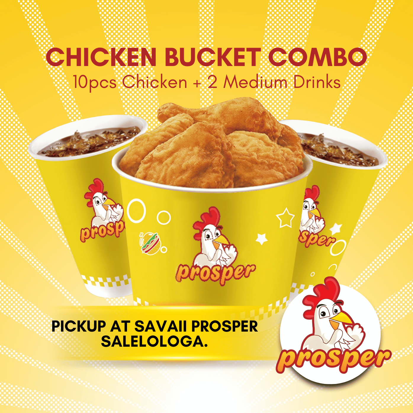 CHICKEN BUCKET COMBO (Pickup from Prosper Savaii in Salelologa).Meal Includes:- 10pcs Chicken- 2 Medium DrinksEnjoy a tasty selection of food... Read more