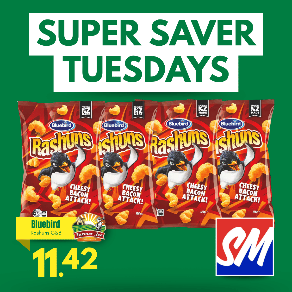 SUPER SAVER TUESDAYS! Bluebird Rashuns Cheese & Bacon / 4 PACK "PICKUP FROM FARMER JOE SUPERMARKET VAITELE ONLY"