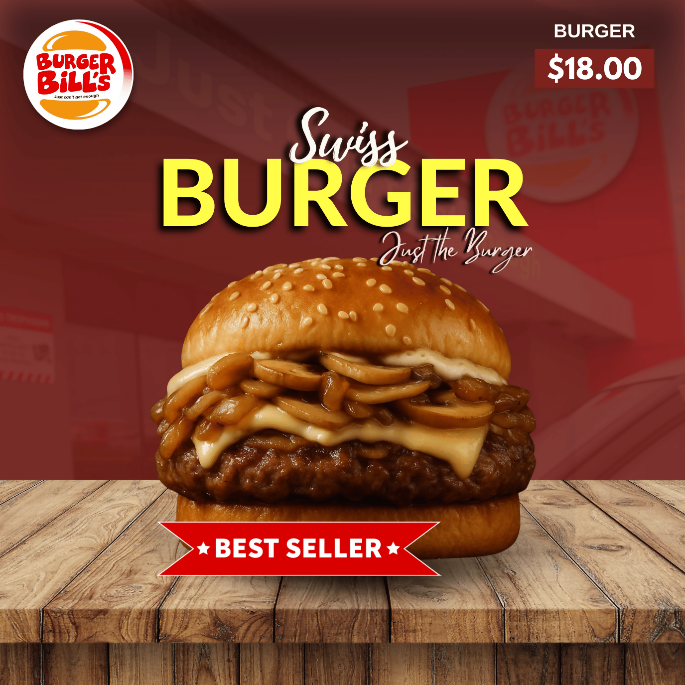 Swiss Mushroom Burger - Just the Burger "PICKUP FROM BURGER BILLS VAITELE ONLY"